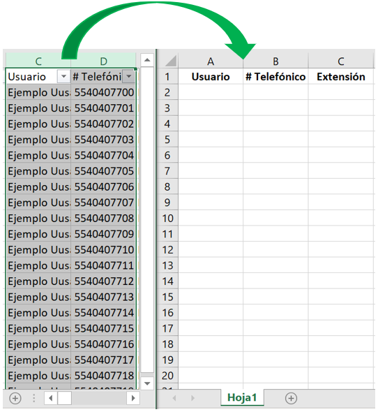 4. Copy columns C and D ( This are the phone numbers and user names of each extension).